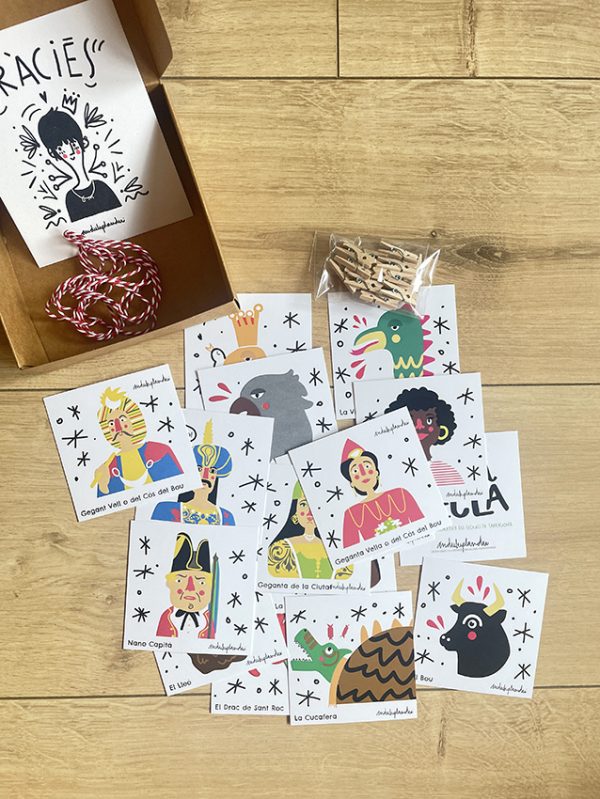15 il·lustracions 8x8cm + pincetes de fusta + cordill vermell i blanc. Tot en una capseta de cartró a punt per regalar o per guardar-hi tresors.